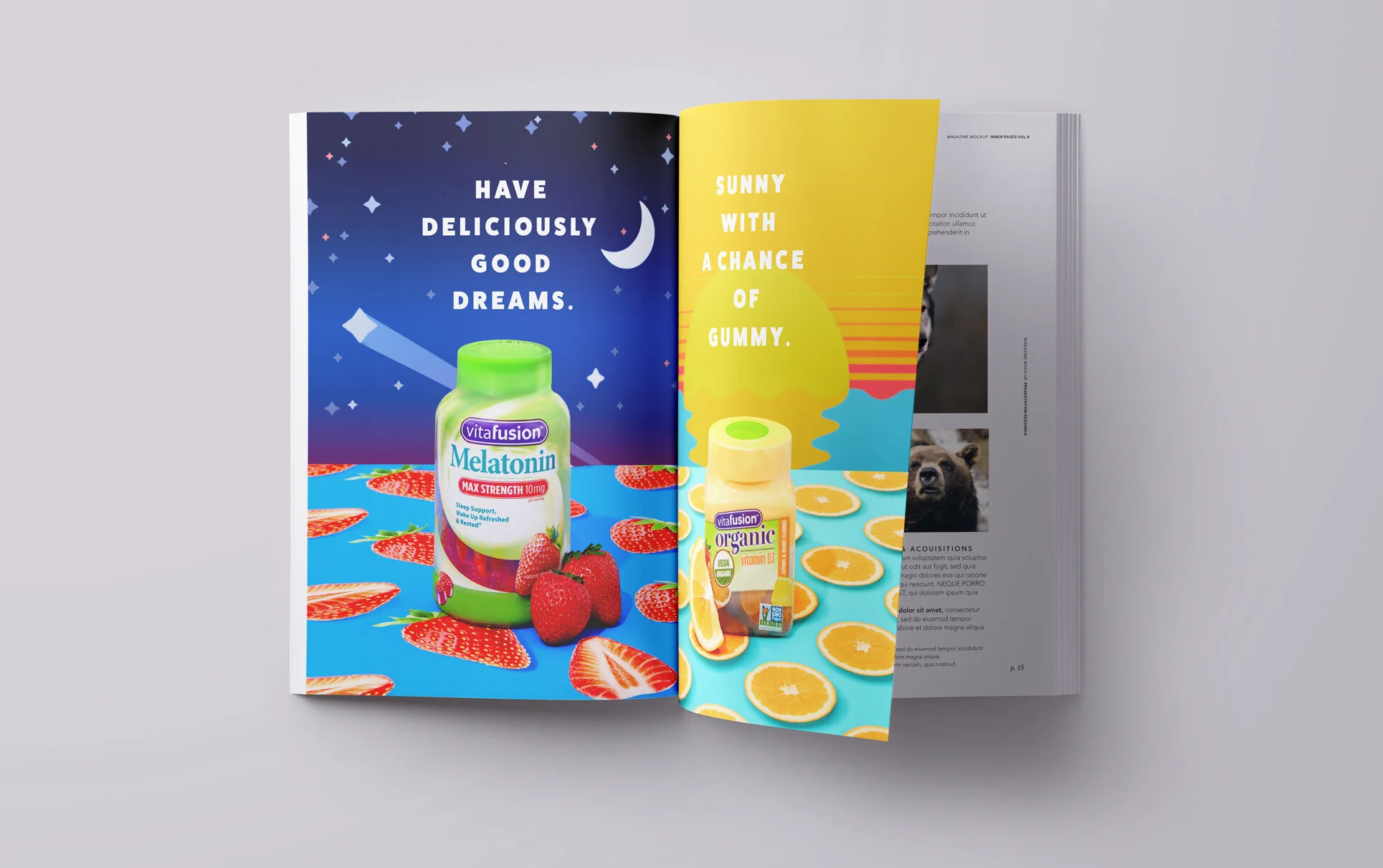 To showcase Vitafusion’s delicious gummy vitamins, we created eye-catching wallpapers to serve as backdrops for a product photo shoot. I was tasked with conceptualizing, illustrating and animating wallpaper backdrops for each product that conveyed the benefits of each type of vitamin. The resulting images are currently being featured in both print and online video.